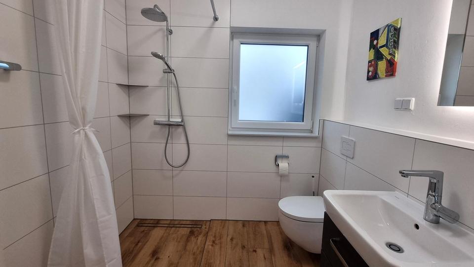 Der offen gestaltete Wohn- und Essbereich mit direktem Zugang zur großzügigen Terrasse und dem fertig angelegten Garten bildet das Herzstück des Hauses. Die hochwertige Einbauküche mit Markengeräten von NEFF fügt sich harmonisch in den Wohnbereich ein. Ein stilvolles Gästeduschbad mit bodengleicher Dusche sorgt im Erdgeschoss für zusätzlichen Komfort.