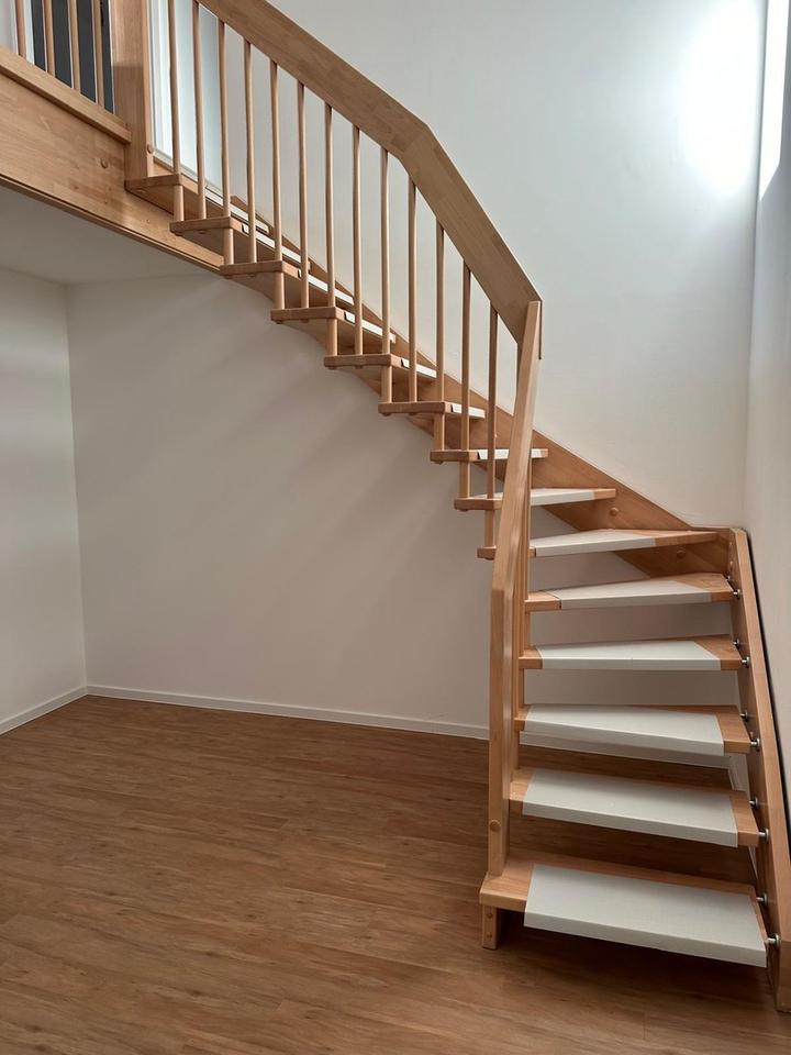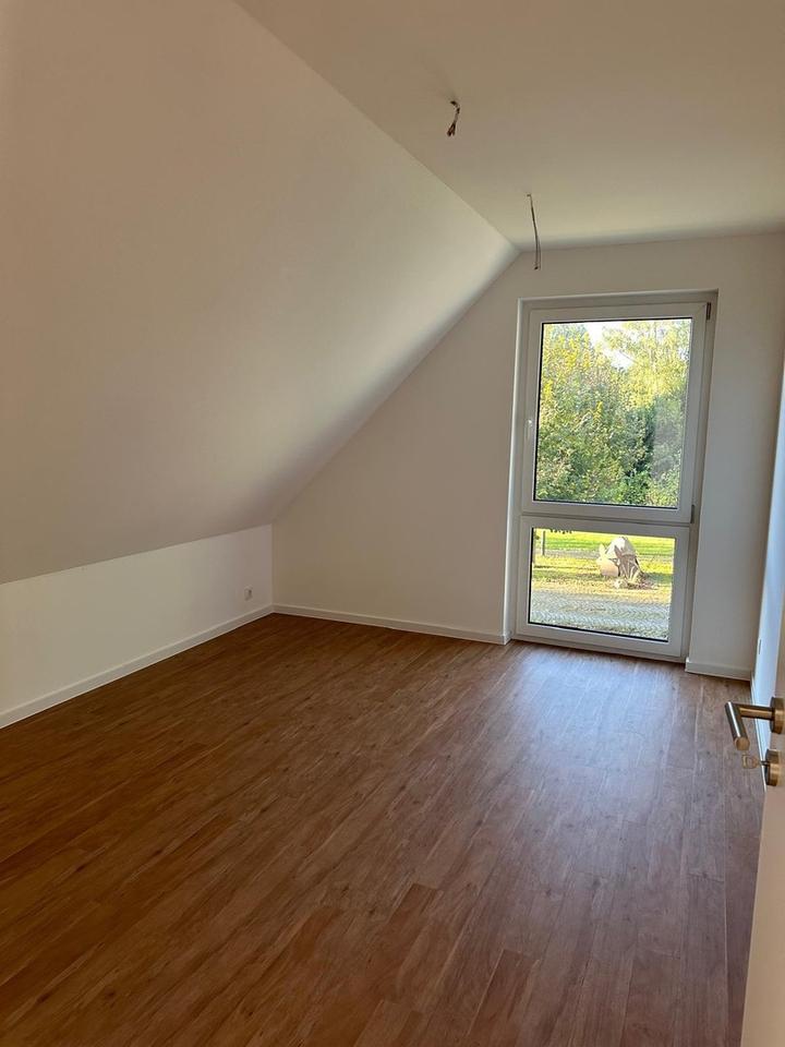 Über einen überdachten Hauseingang gelangen Sie in die großzügig geschnittene Wohnung mit ihren insgesamt 130 m². Hier erwarten Sie ebenerdig der offene Wohn-, Ess- und Kochbereich, das Gäste-WC sowie der Hauswirtschaftsraum. Das Obergeschoss erreichen Sie über eine geschwungene offene Echtholztreppe. Dort finden Sie einen weiteren offenen Wohnbereich sowie drei Schlafzimmer. Darüber hinaus befindet sich das moderne, große Vollbad im Obergeschoss. Vom offenen Wohnbereich gelangen Sie über eine Ausziehtreppe auf den Dachboden, der nach weiterem Ausbau als zusätzlicher Stauraum oder Spielboden (keine Stehhöhe für Erwachsene) dient.