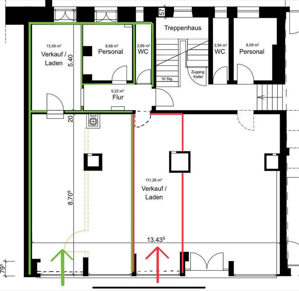 1: Grün eingezeichnete Fläche mit ca. 76m2 plus ca. 26m2 Lagerfläche in zwei Kellerabteilen für €7.800 pro Monat. Eine Schaufenstertüre und zweites Schaufenster an der Front.