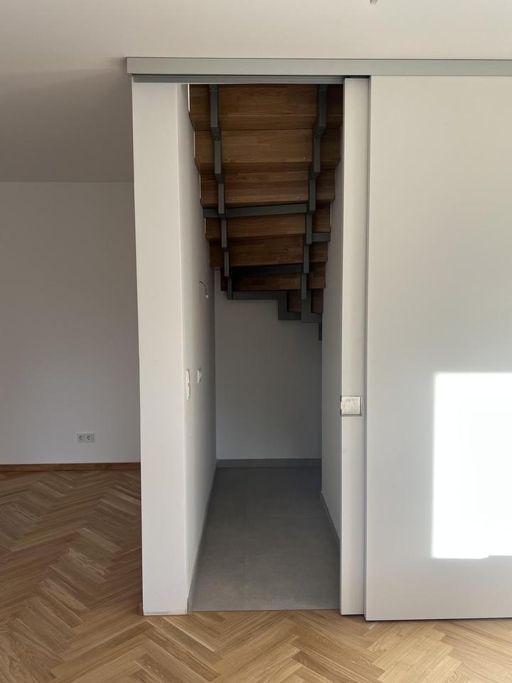 Im Erdgeschoß erreichen Sie den offenen Wohnraum über die Garderobe mit angeschlossenem Gäste WC / Hauswirtschaftsraum. Die Küchenzeile mit Kochinsel ist optimal in den Wohnraum integriert und bietet perfekten Überblick. Die Treppe ins Obergeschoss kann mit einer raumhohen zweiflügligen Schiebetür verschlossen werden. Ein kleiner Abstellraum unter der Treppe ist als begehbarer Schrankraum direkt von der Küche erreichbar. Ein großes Hebeschiebefenster, verbindet den Wohnraum mit der angrenzenden Terrasse und dem Garten auf der Westseite.