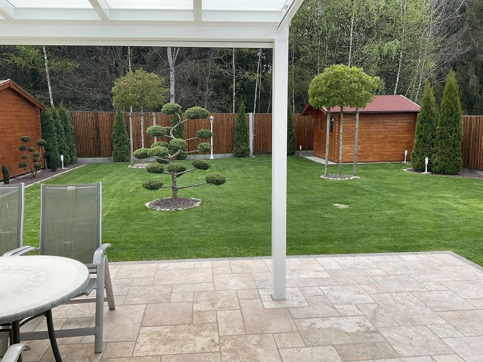 Der traumhaft angelegte Garten mit liebevoll arrangierten Bonsai- und Thujen-Pflanzungen sowie direktem Zugang zum angrenzenden Wald schafft eine einzigartige Verbindung aus Natur und Wohnkomfort.
