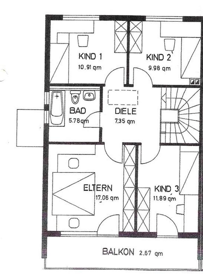 Treppauf gelangt man in eine weitere Diele die genug Platz für Stauschränke und Regale bietet. Die Diele ist genau mittig zwischen Elternschlafzimmer, Kinderzimmern und Bad – somit halten sich trotz großer Diele die Laufstrecken gering. Durch das Elternschlafzimmer und dem Kinderzimmer Nr. 3 gelangt man auf den Südbalkon, welcher von uns hauptsächlich als Wäschetrocknungsplatz genutzt wurde. Die Wäsche konnte dort im Sommer gut (teilweise mit Schatten um Ausbleichen zu umgehen) trocknen. Er ist aber ebenfalls groß genug um sich dort einen schönen Entspannungsbereich einzurichten.