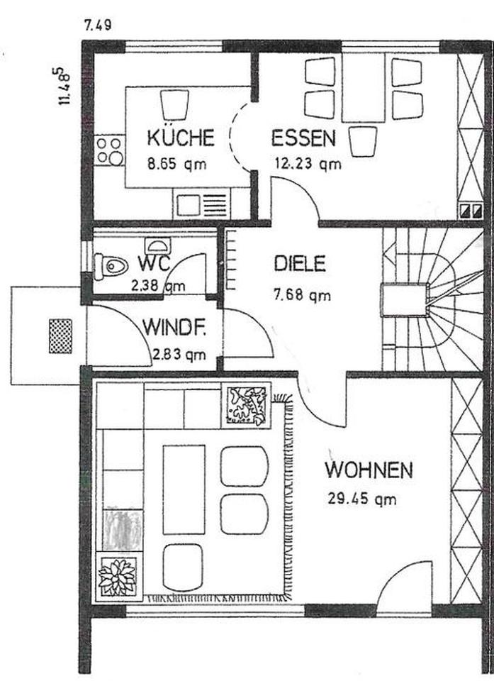 Betritt man die DHH steht man erstmal in einem Windfang, was praktische ist, um Straßenschuhe abzulegen. Von dort aus geht es entweder ins kleine Gäste-WC oder in die Diele, durch die man zum großen Wohnzimmer oder der gemütlichen Esszimmer-Küche kommt. Auf der Südterrasse findet unter der 2025 erneuerten Markise eine große Outdoor-Lounge leicht Platz.