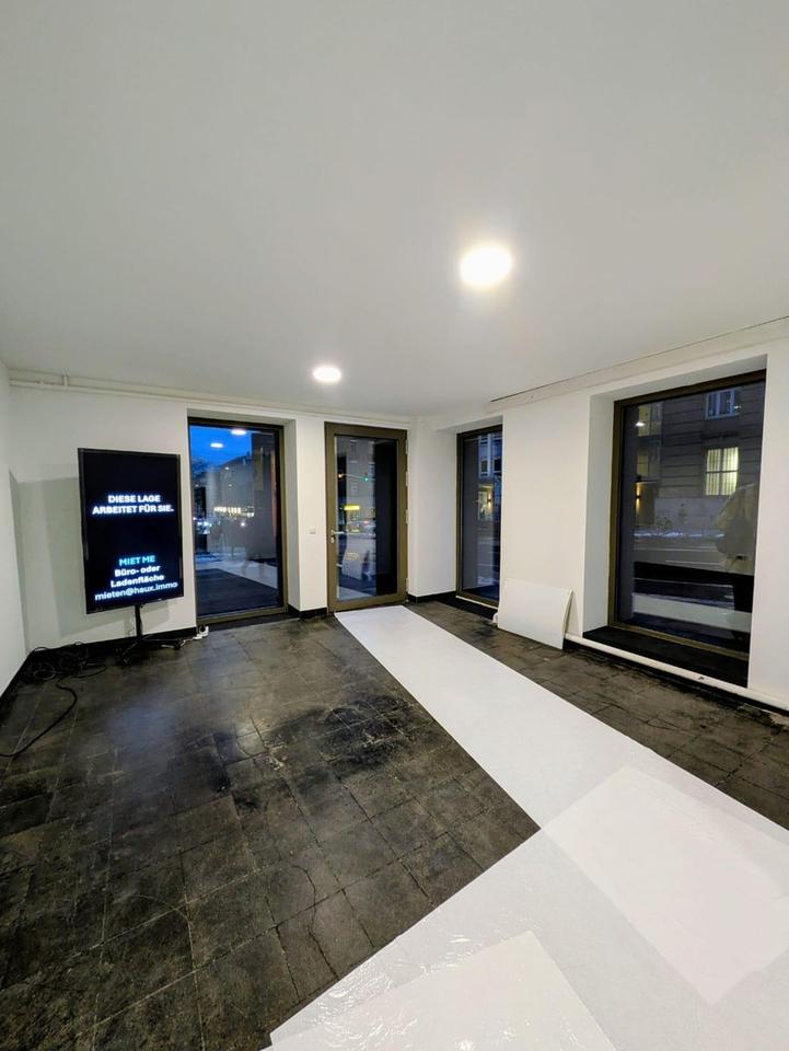 Die große Fensterfront zur Straße sorgt für sehr gute Sichtbarkeit und ermöglicht einen offenen Empfangs- oder Wartebereich im vorderen Teil der Fläche. Der hintere Bereich eignet sich hervorragend für ruhige Behandlungsräume, Beratungsräume oder Büros.