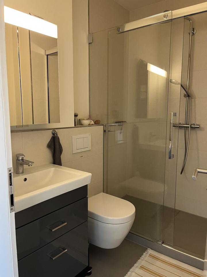 Die Wohnung verfügt über zwei moderne Bäder – eines mit bodentiefer Dusche und eines mit Badewanne.