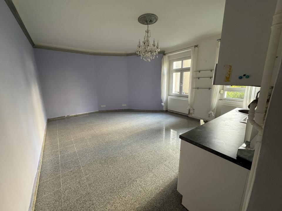 Der Mittelpunkt der Wohnung ist das großzügige Wohnzimmer mit gut integrierter Küchenzeile, die Kochen, Essen und Wohnen harmonisch miteinander verbindet. Große Fenster lassen viel Tageslicht hinein und schaffen eine freundliche Atmosphäre.