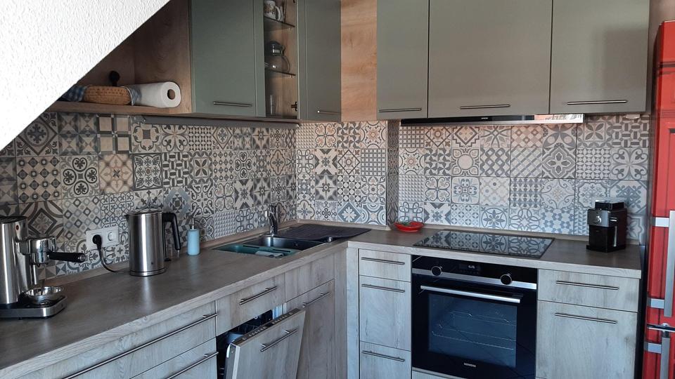 Die Marken- Einbauküche stammt aus dem Jahr 2019 und ist absolut neuwertig. Die Arbeitshöhe beträgt ca. 100 cm, dadurch ist auch mehr Stauraum möglich. Ofen, Herd, Dunstabzug und Spülmaschine sind aus der studio-line-Serie von Siemens, der Herd ist ein Induktions- Kochfeld. Die Kühl- Gefrierkombination steht nicht zum Verkauf, der Platz ist gut ausreichend für ein Stand-alone-Gerät wie bei uns. Das Spülbecken ist von Blanco mit Grohe-Armatur.