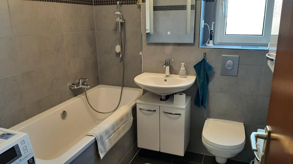 Anschließend gelangt man zum Wannenbad, das in 2019 grundlegend modernisiert wurde. Eingebaut wurde eine Kunststoffwanne und ein neues Waschbecken sowie WC (Villeroy & Boch) mit neuer Spülanlage. Alle Armaturen sind von Grohe. Die passenden Schränke werden mitverkauft. Im Bad befindet sich der Waschmaschinenplatz. Neu gefliest wurde mit Granitfliesen.