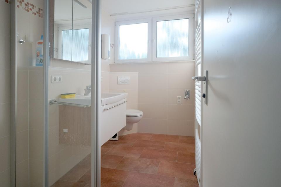 Zentral zwischen den Schlafzimmern liegt das Badezimmer. Es bietet barrierefreies Design und Funktionalität.