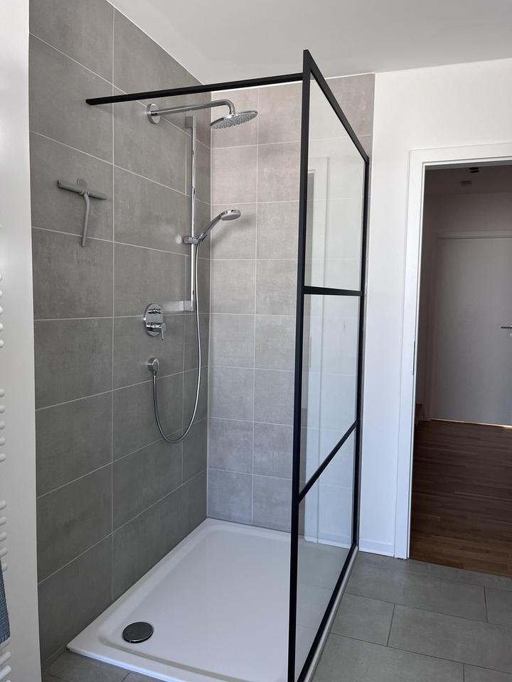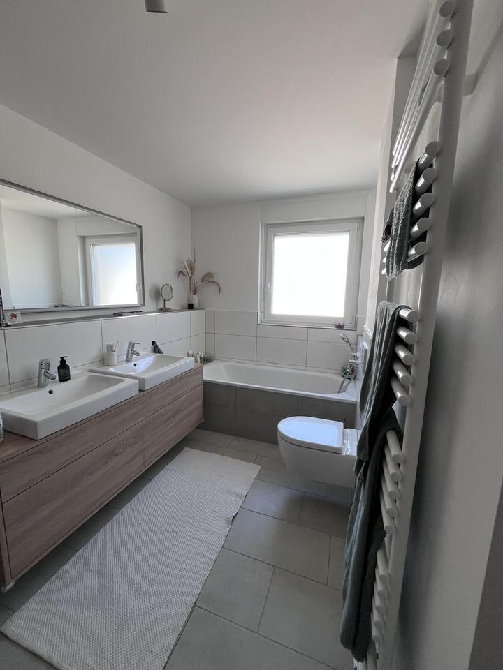 Die erste Etage bietet neben drei hellen Zimmern, welche sich ideal als Schlaf-/ Kinderzimmer oder Büro eignen, ein helles und modernes Badezimmer mit zwei Waschbecken, Wachtisch, Badewanne sowie großer Dusche mit Glasabtrennung.