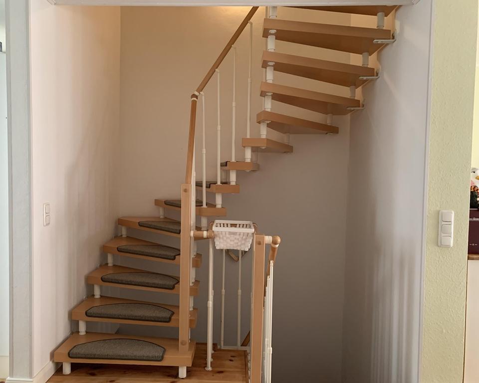 • Über die offene, gewendelte Holztreppe, die sich bis zum Dachgeschoss erstreckt, gelangen Sie zunächst zum ersten Obergeschoss.