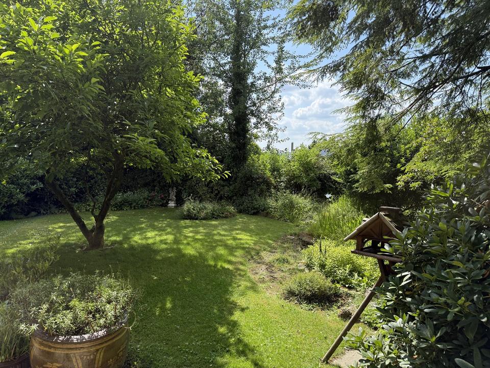 Der große, mit schönen Bäumen und Sträuchern bewachsene Garten, in dem sich zwei Teiche befinden, ist sonnig, verfügt aber auch über schattige Plätze und ist pflegeleicht. Bäume und Sträucher schützen das Grundstück vor neugierigen Blicken. Durch Rückschnitt der Sträucher kann die Rasenfläche erheblich erweitert werden.
