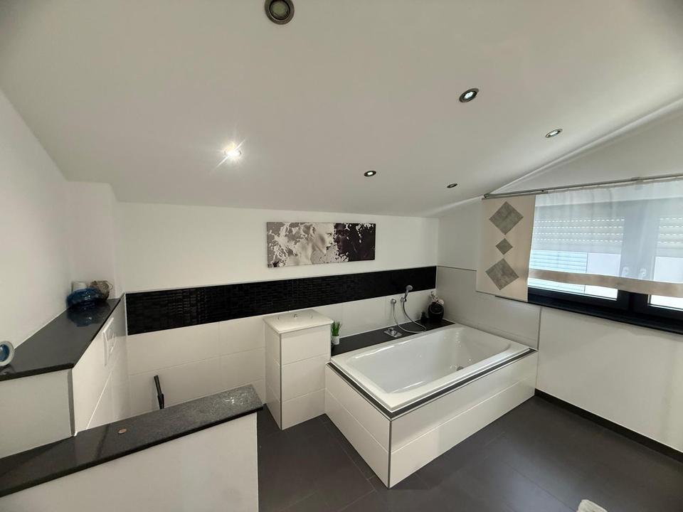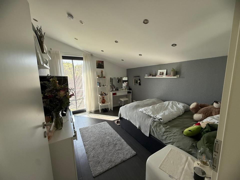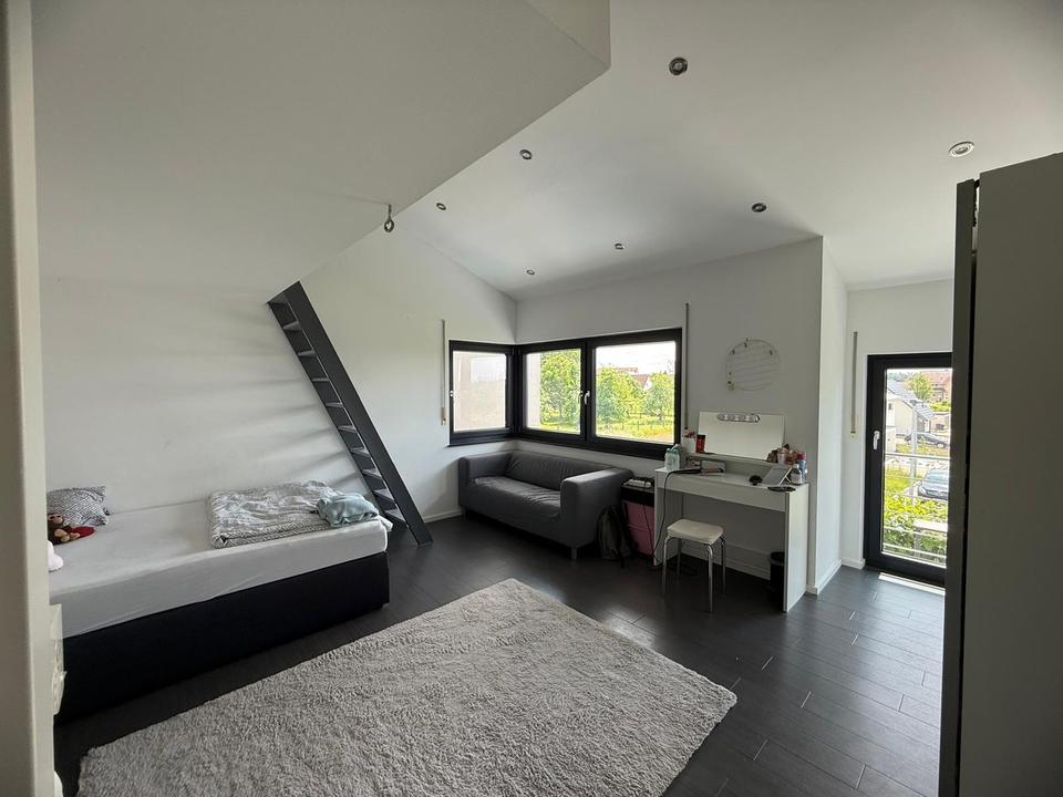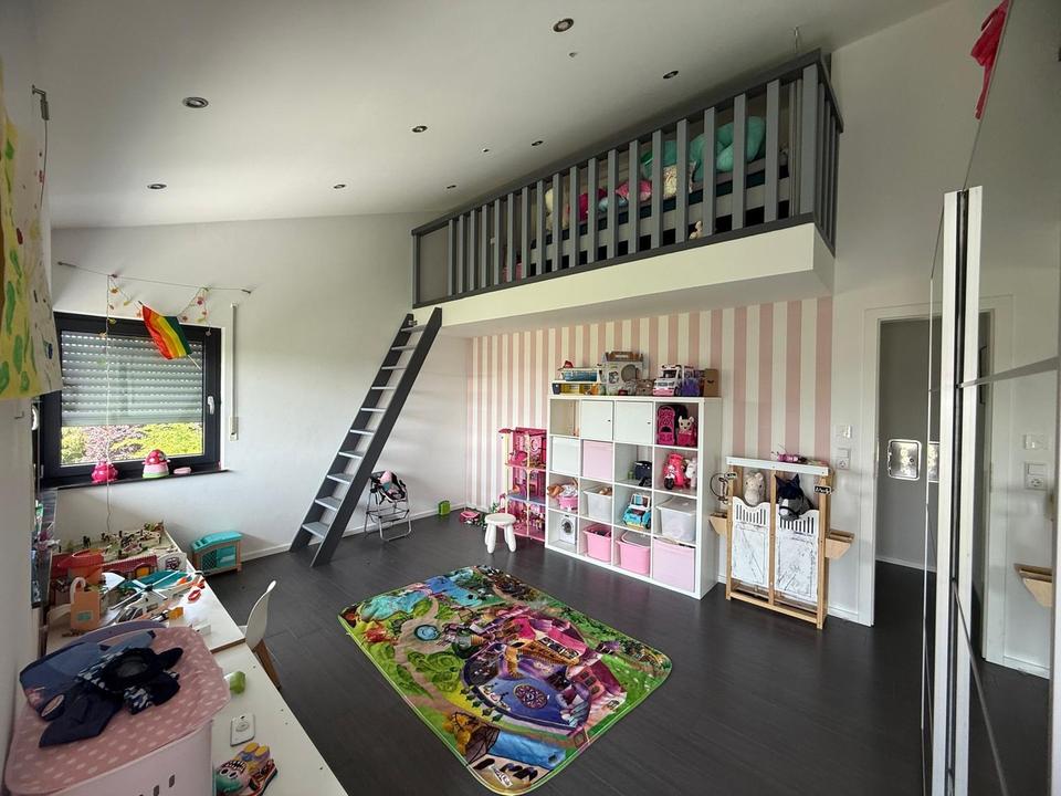 Im Obergeschoss befinden sich ein Elternschlafzimmer mit Ankleide, zwei Kinderzimmer mit Galerie-Ebene sowie ein modernes Bad mit Wanne und bodengleicher Dusche.