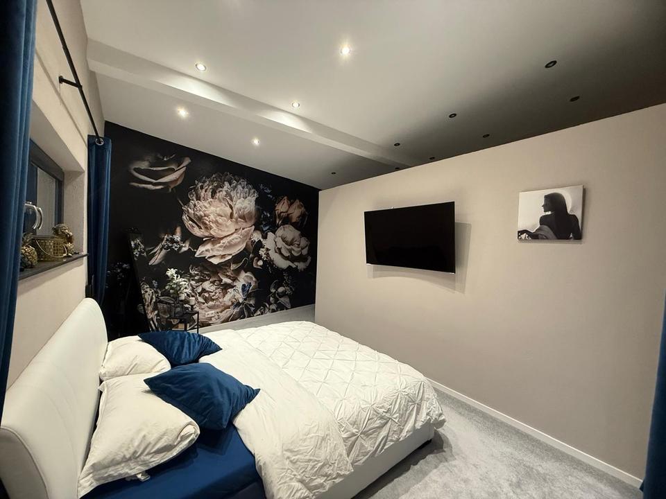 Die Einliegerwohnung verfügt über ein Schlafzimmer mit Ankleide, ein hochwertiges Bad sowie einen offenen Wohn- und Küchenbereich.
