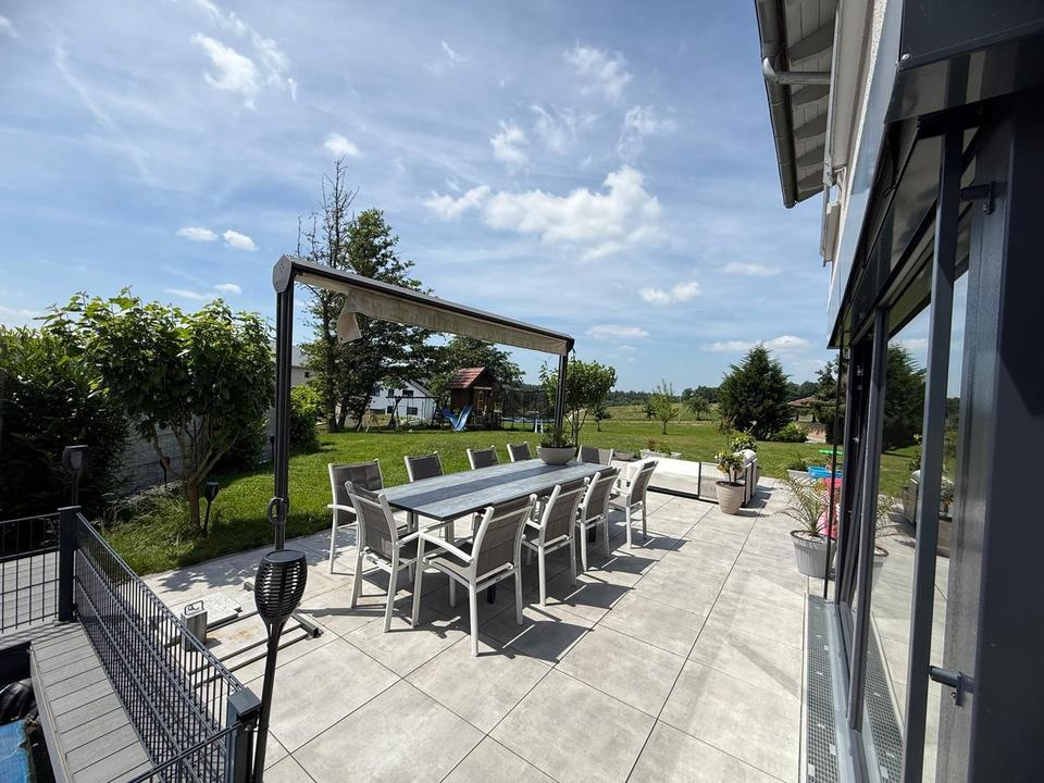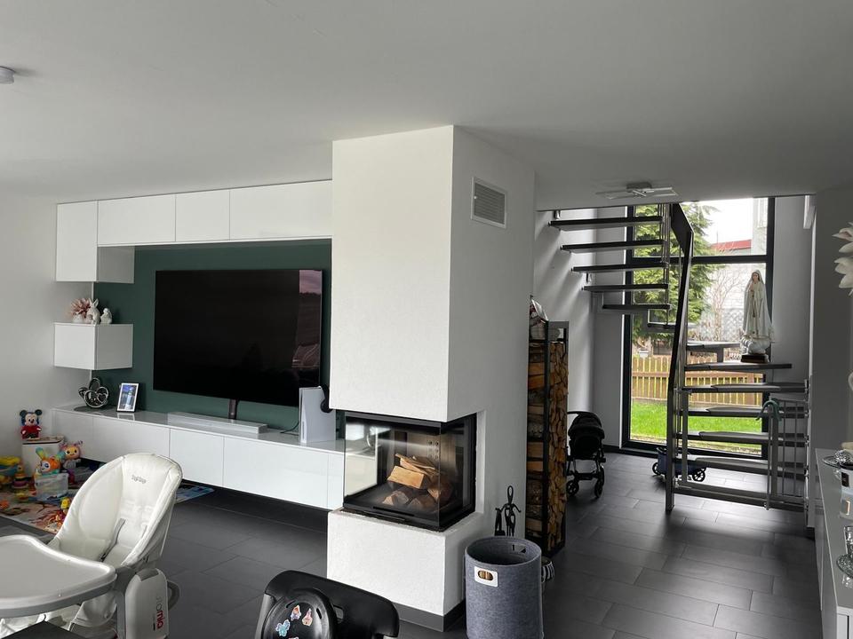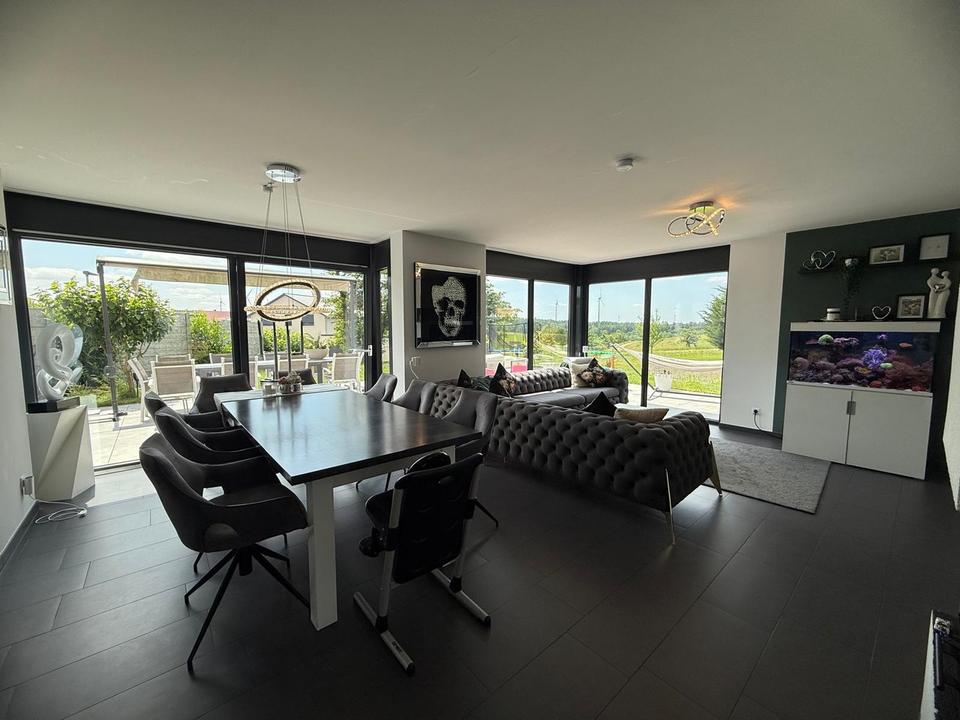 Der offene Wohn- und Essbereich mit bodentiefen Fenstern, direktem Zugang zur Terrasse und stilvollem Kamin schafft eine helle, angenehme Wohnatmosphäre. Die hochwertige Küche mit separater Speisekammer lässt sich bei Bedarf elegant vom Wohnbereich abtrennen.