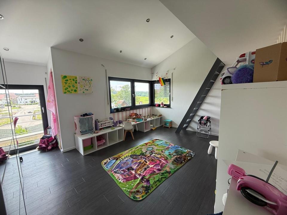 Im Erdgeschoss stehen zusätzlich ein Kinder- bzw. Spielzimmer, ein Gäste-WC, ein Hauswirtschaftsraum sowie ein flexibel nutzbares Zimmer (z. B. als Büro, Fitness oder Gästezimmer) zur Verfügung.