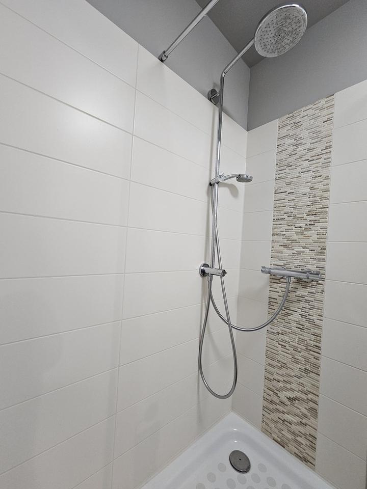 Zudem befindet sich in der Etage ein Gästezimmer/Büro und ein Duschbad. Das Duschbad wurde analog zum unteren Wannenbad, mit einem dunklen Boden, mit hellen Wandfliesen und zur Auflockerung mit farblich akzentuierten Mosaikfliesen in Teilbereichen ausgestattet.