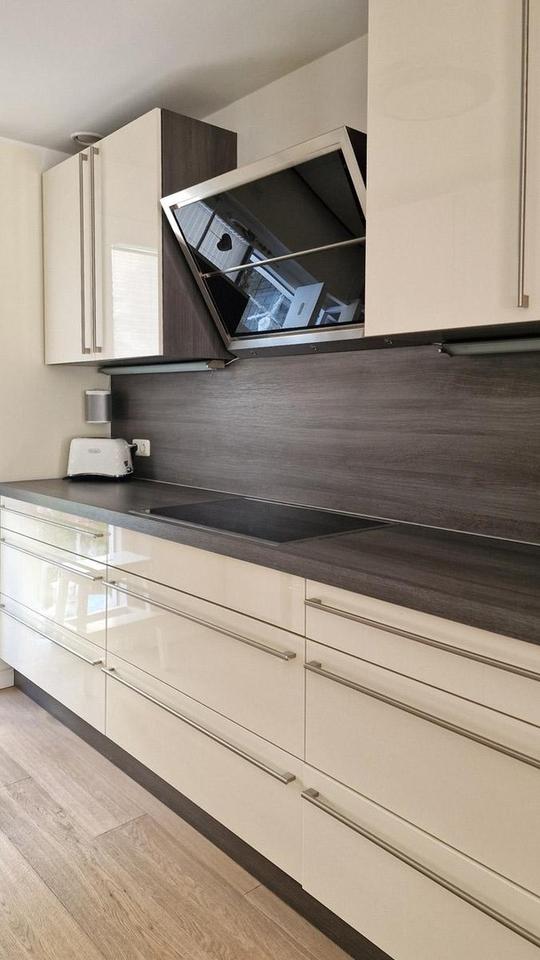 Die direkt angrenzende, moderne Nolte-Küche in Magnolia Hochglanz und Arbeitsflächen in Rauchsilber-Eiche verbindet Funktionalität mit zeitloser Eleganz. Ausgestattet mit Markengeräten (AEG, Neff und Falmec) und einer edlen Keramikspüle von Villeroy & Boch, lässt sie keine Wünsche offen. Ein praktischer Abstellraum unter der Buchentreppe, ein geschmackvolles Gäste-WC und der Hausanschlussraum bereichern den Wohnkomfort.
