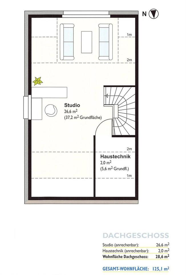 Das loftartige Dachgeschoss präsentiert sich als ein großes, helles Studio, das vielfältige Nutzungsmöglichkeiten bietet – ob als Arbeitszimmer, Gästebereich oder Spielparadies. Auch hier ist die Unterteilung in zwei Zimmer flexibel gestaltbar. Der Heizungs- und Technikraum komplettiert diese Ebene.