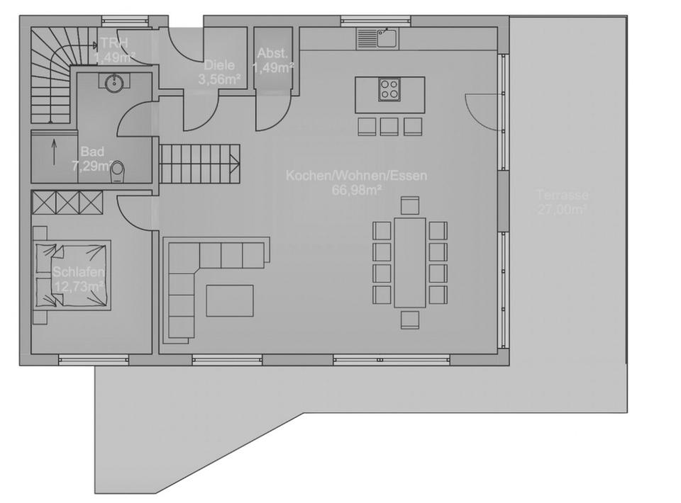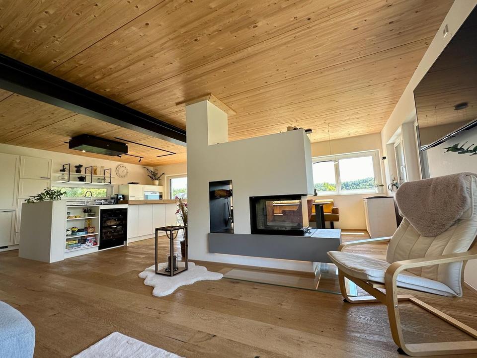 – Offener Wohn- und Essbereich mit dreiseitigem Holzkamin