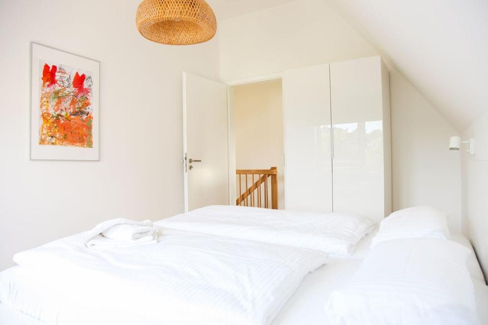 Innenausbau: Filigrandecken/Deckenfugen gespachtelt/geschliffen; Wände auf Malervlies, helle/weiße Anstriche. Fliesen-/Belagskonzept nach Bemusterung; in Schlaf-/Relaxbereichen Design-PVC „Purline“ (Wineo 1000, wood-Kollektion o. glw.) mit weißen Sockelleisten. Innentüren glatt, gefälzt, EPC-Lack Reinweiß; Drückergarnituren Edelstahl. Offene Massivholztreppe (Eiche, stabverleimt) mit Geländer im Relaxbereich.