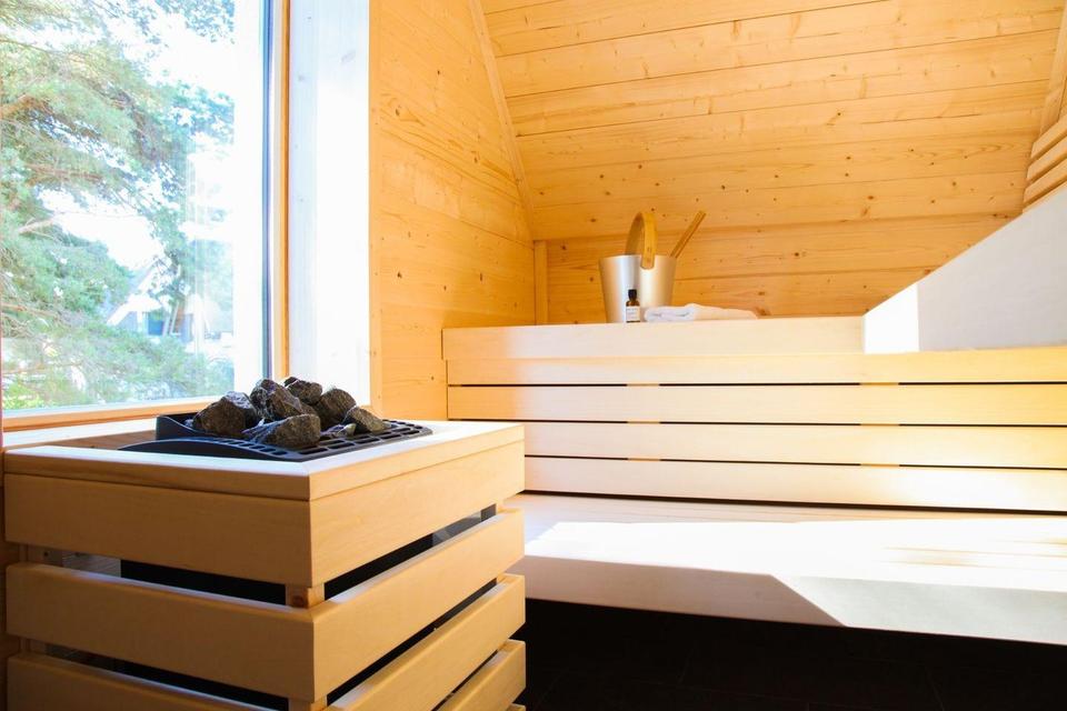 Wellness & Bad: Eingebaute Sauna; bodengleiche Duschen mit Rinneneinlauf (TECE Designrost Basic Edelstahl o. glw.) und Echtglas-Duschabtrennungen (ESG, ca. 2,10 m). Sanitärobjekte u. a. VIGOUR derby o. glw., Vorwand-Spülkasten mit Spartaste. Handtuchheizkörper (Leiterform) in Bad/Wellness.