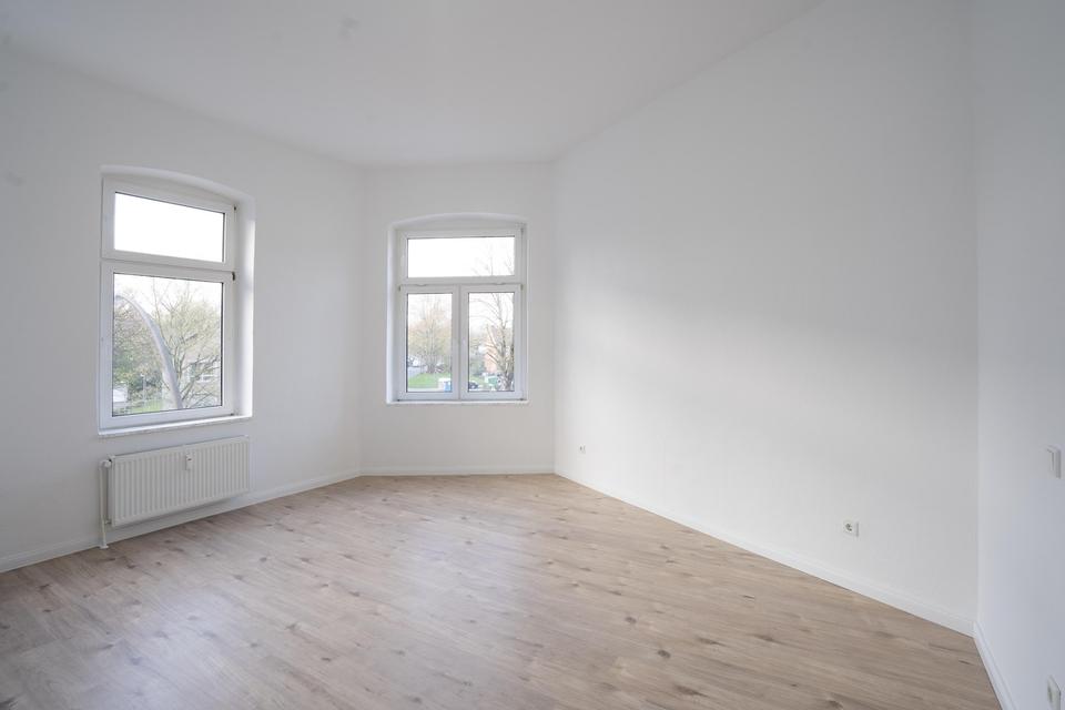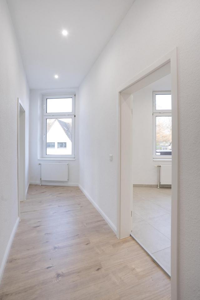 Das Raumangebot umfasst ein helles Wohnzimmer, ein Schlafzimmer, eine großzügige Küche mit Essbereich sowie einen Flur, ein Duschbad und ein separates (Gäste-)WC.