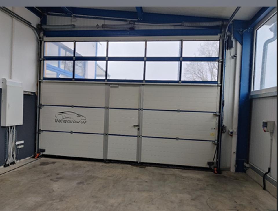 Die Werkstatt verfügt über eine hohe Decke mit Stahlträgern, Betonboden und ein großes Rolltor (ca. 5,0 m x 3,5 m).