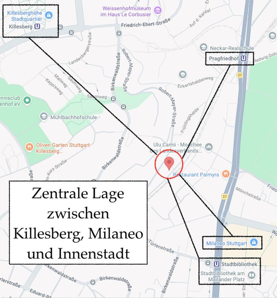 Mehrere U-Bahn-Haltestellen sind in wenigen Minuten erreichbar und ermöglichen eine schnelle Anbindung an die Stuttgarter Innenstadt sowie den Hauptbahnhof.
