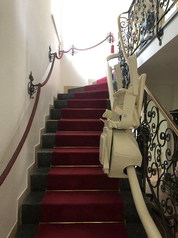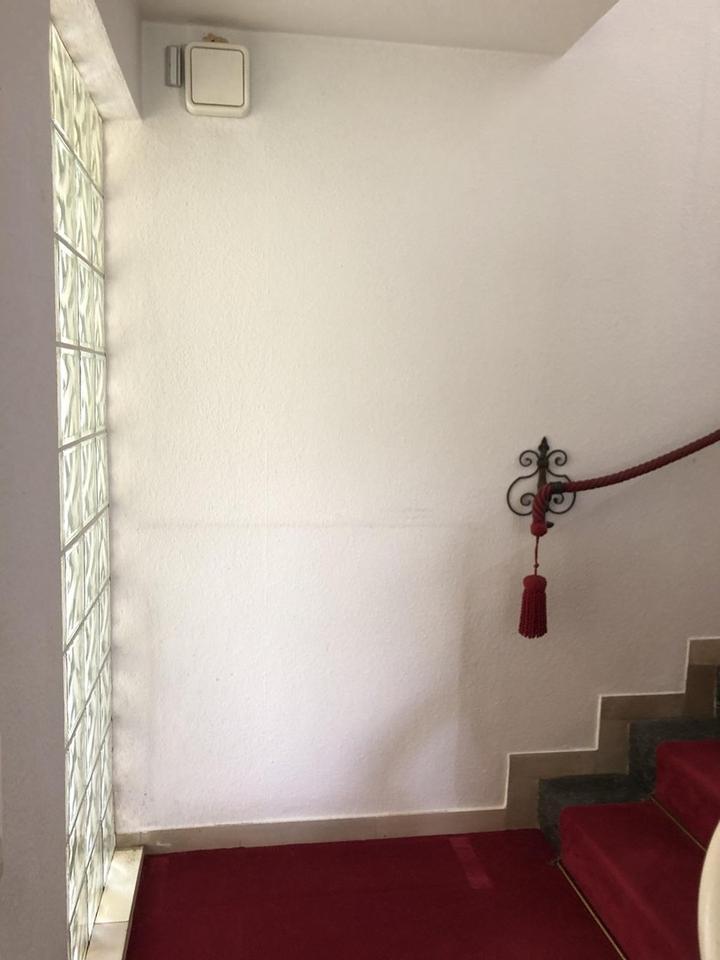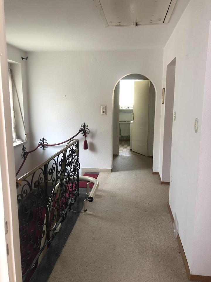 Links liegt das offene Treppenhaus mit schmiedeeisernem Geländer und Galerie sowie gegenüber die Zugänge zu Wohn- und Esszimmer, Küche, Gäste-WC und Keller. Ein Treppenlift ist vorhanden.