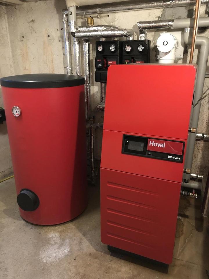 Die Energieversorgung erfolgt über eine moderne Gas-Zentralheizung (Hoval-Brennwertgerät, Baujahr 2020) mit Warmwasserspeicher, die bereits für den Anschluss einer Wärmepumpe vorbereitet ist.