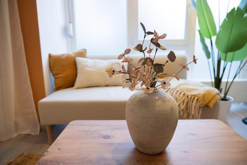 Dezente, natürliche Einrichtung mit warmen Farbtönen und modernem Stil