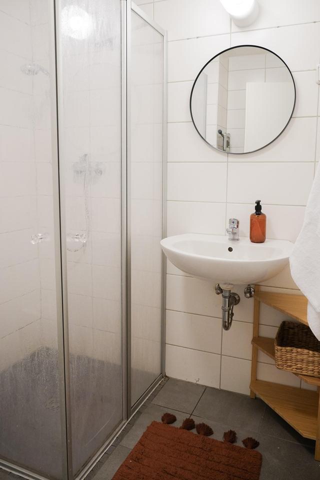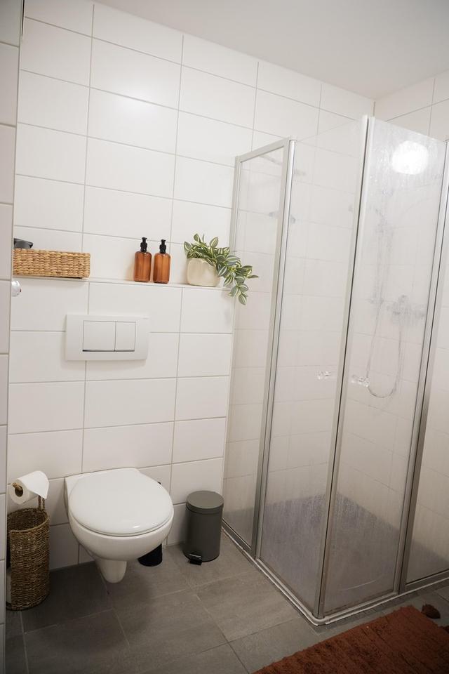 Bad mit Dusche, Handtüchern und Pflegeprodukten