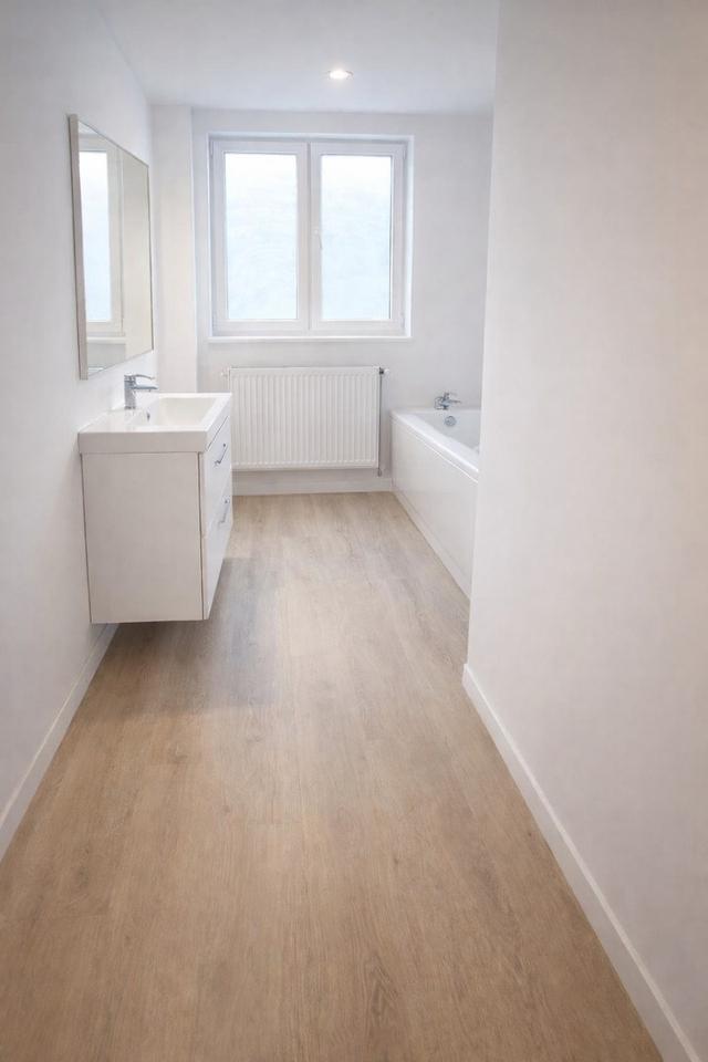 Hochwertige Kernsanierung mit Erneuerung von Böden, Wänden, Bädern, Türen und Treppe.