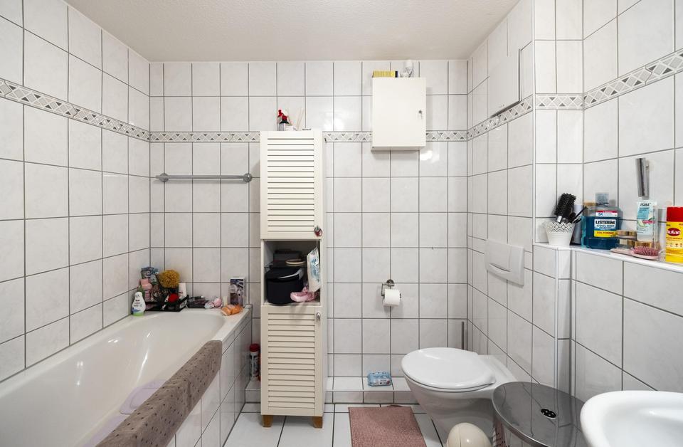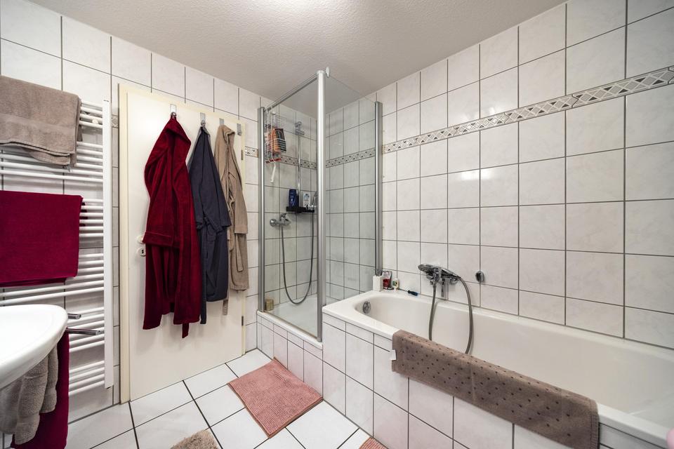 Auf der ersten Etage befinden sich drei Räume, von denen aktuell zwei als Schlafzimmer und einer als Arbeitszimmer genutzt werden. Das zeitlos hell geflieste Badezimmer mit Dusche und Badewanne befindet sich ebenfalls auf dieser Etage.