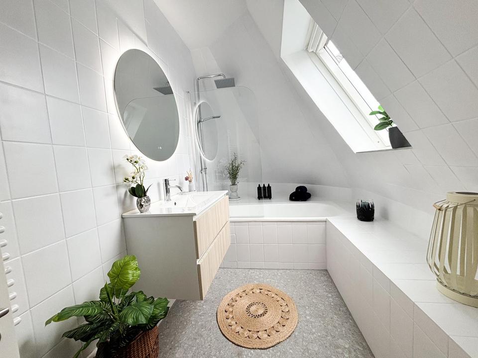 Das Badezimmer ist gestaltet mit Badewanne, Fenster und Handtuchheizkörper. Die neuen Terrazzo-Fliesen auf voller Höhe geben dem Raum eine besondere, ruhige Eleganz. Ergänzt wird das Ganze durch ein separates WC mit eigenem Waschmaschinenanschluss.