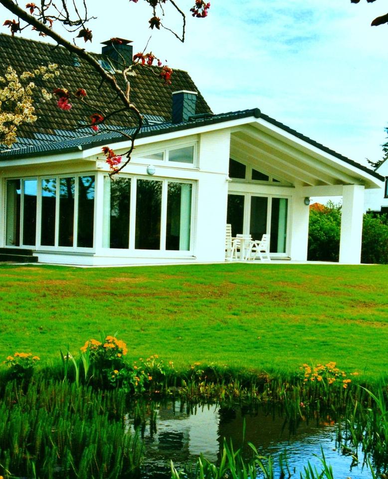 Das solide Einfamilienhaus wurde 1972 voll unterkellert erbaut und 2005 durch einen lichtdurchfluteten 65 m² Anbau erweitert, dessen Deckenhöhe deutlich über die Erdgeschossebene des Bestandshauses hinausreicht. Bodentiefe Fenster und direkte Zugänge zu den Terrassen und dem Garten verbinden auf wunderbare Weise das Drinnen und Draußen. Die offenen Übergänge zwischen den zwei zum Garten hin liegenden Wohnräumen und dem Anbau sorgen für ein ganz besonderes Wohnambiente – ideal für gesellige Runden und entspannte Stunden am Kamin oder im Grünen. Im Erdgeschoss erwarten Sie außerdem eine vollausgestattete Wohnküche mit Platz für einen Esstisch, ein fensterbelüftetes Gäste-WC und ein weiterer schöner Raum mit direktem Zugang zum barrierefreien Duschbad.
