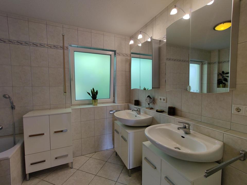 Im ersten Obergeschoss befinden sich drei Zimmer als Schlaf-/Kinder-/Arbeitsräume. Das Bad hat Fußbodenheizung und Wandheizkörper, Dusche, Badewanne und zwei Waschbecken.
