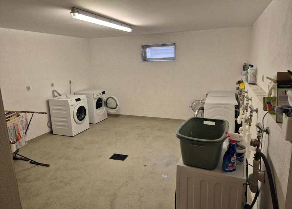 Gemeinschaftsräume im Keller bieten Platz für Waschmaschine, Trockner und Fahrrad. Es gibt einen separaten Trockenraum für die Wäsche.