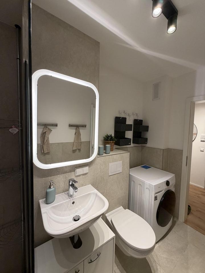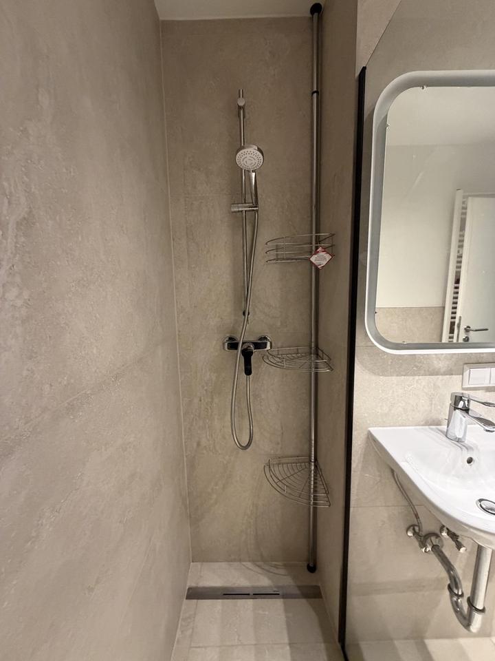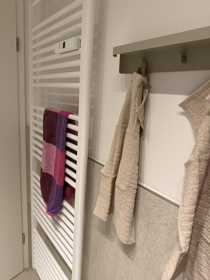 – Großzügiges modernes Badezimmer mit Dusche, Handtuchheizkörper und neuer Waschmaschine und Ablagemöglichkeiten, Handtuchhaltern