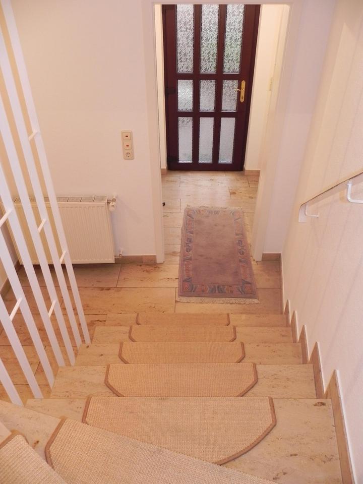 Über die breite Treppe gelangen Sie in das Obergeschoss mit einer großen Einbauküche (Kühlschrank und Herdplatte/Backofen vorhanden, keine Geschirrspülmaschine) und dem großem Wohnzimmer (ca. 32qm). Alle Fenster im UG verfügen über elektrische Rollläden.