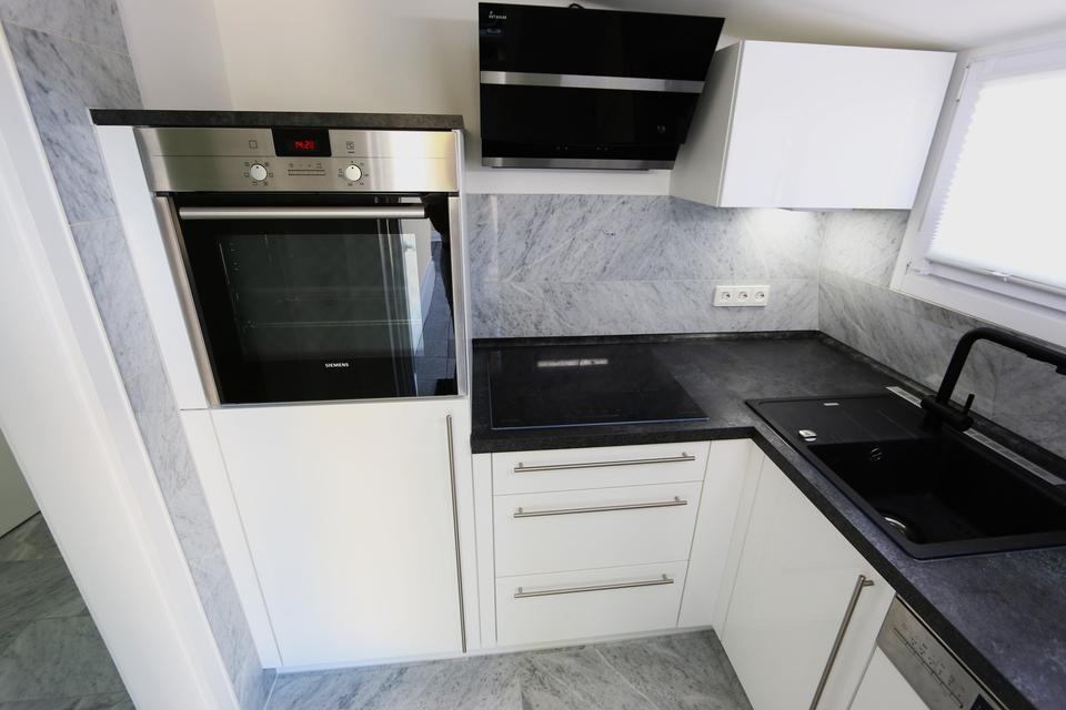 Siemens Backofen, Kühlschrank mit Eisfach, Induktionskochfeld mit moderner Umlufthaube, Siemens Spülmaschine, LED Beleuchtung