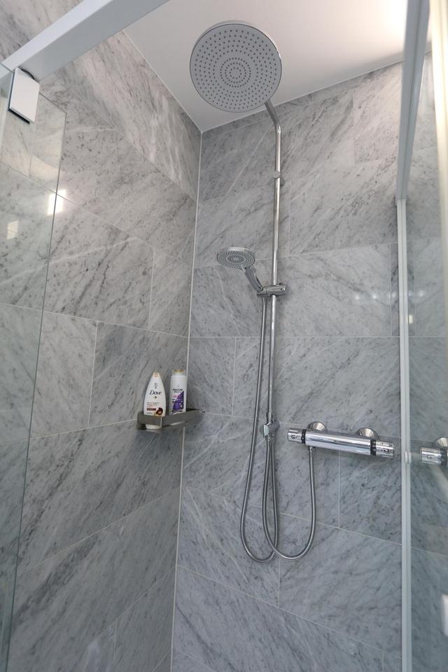 Dusche mit Regenbrause und Glasabtrennung, WC spülrandlos, Waschtisch mit Unterschrank, großer Badspiegel mit LED Beleuchtung, Waschmaschine