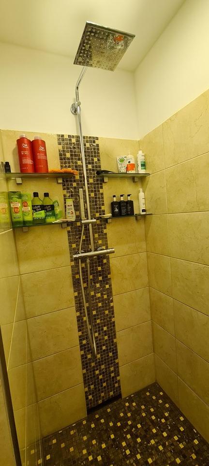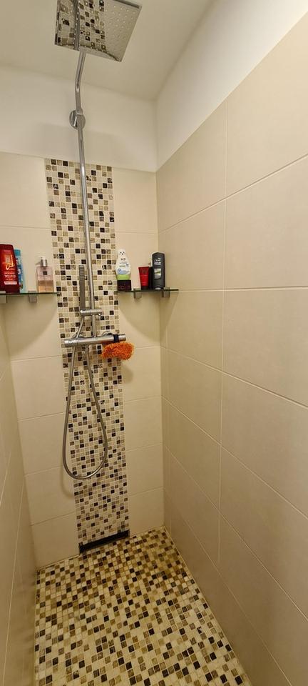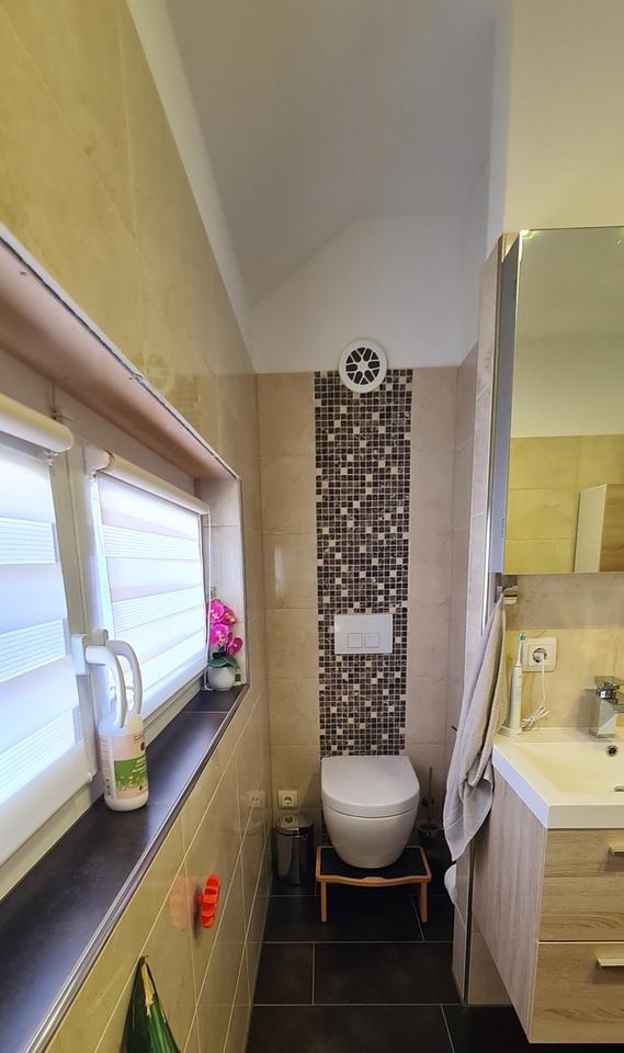 Im Erdgeschoss ist ein Gäste WC mit eingebaute Dusche und großen Waschbecken.