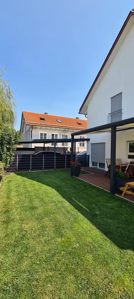 Neben dem Haus ist ein Carport mit Photovoltaik und einer Größe von 7×3,50m. Photovoltaik befindet sich nicht nur auf dem Carport sondern auch auf dem Dach vom Haus genauso wie auf dem Gartenhaus und auf der Lounge.