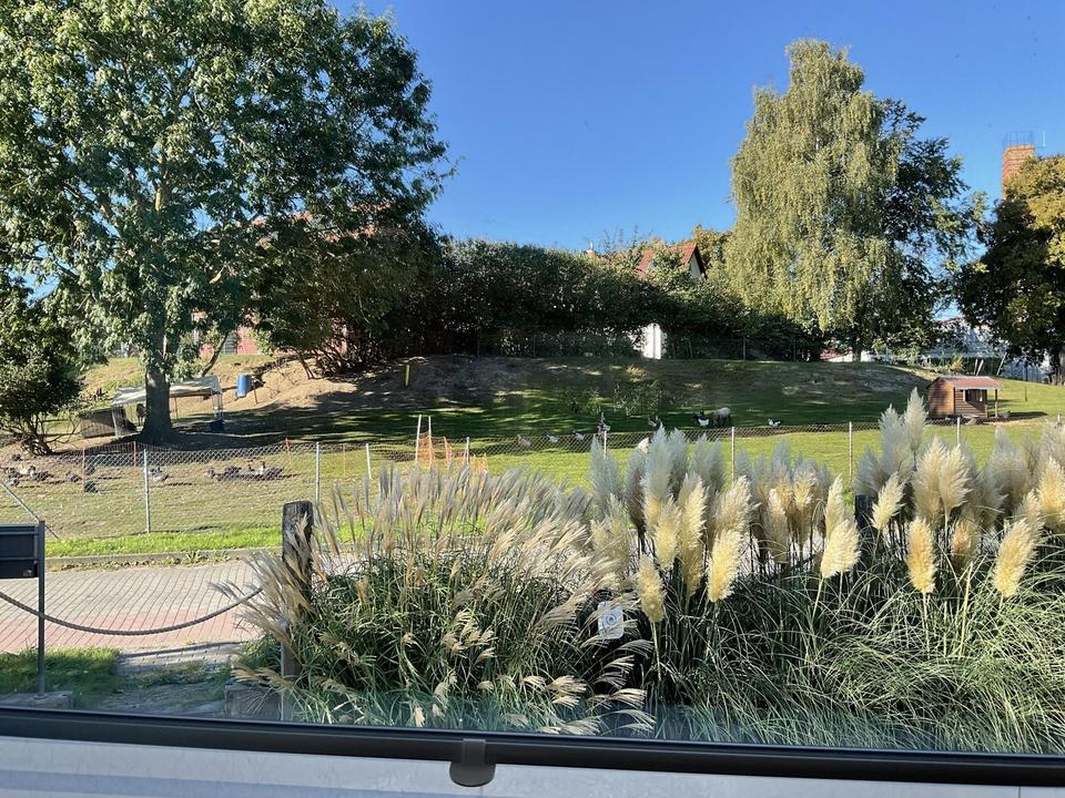 Das Grundstück liegt in einer Spielstraße nahe der Dorfkirche mit einer sehr netten und hilfsbereiten Nachbarschaft aus Einheimischen und Zugezogenen. Von jedem Fenster blickt man ins Grüne, auf Weiden, Bäume, Schafe, Pferde, manchmal Kraniche, Rehe, Milane und andere Tiere. Das große Grundstück ist komplett eingezäunt, und eignet sich auch gut für Hundehalter. An der Zufahrt des Carports befindet sich ein elektrisches Tor. Vor dem Haus und auf dem Grundstück befinden sich insgesamt vier Parkplätze.