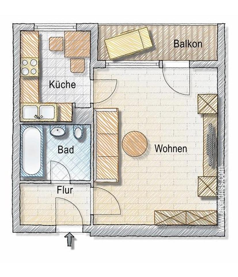 Die Küche befindet sich in einem separaten Raum und ist mit einer eingebauten, gebrauchsfertigen Küchenzeile versehen, die aus Kühlschrank, Herd und Backofen besteht. Zusätzlich befindet sich hier ein an die Wand montierter Klapptisch, welcher zum Essen in der Küche einlädt. Das Badezimmer verfügt über eine Badewannendusche, Anschlüsse für eine Waschmaschine und einen montierten Spiegelschrank über dem Waschbecken. Im Zwischengang zum Badezimmer befindet sich eine praktische Nische mit zusätzlichem Stauraum. Angrenzend an das schöne und große Hauptzimmer liegt der Balkon mit Blick auf den Innenhof. Hier bietet sich ausreichend Platz für eine Sitzgarnitur. Die Ausrichtung des Balkons ist Richtung Westen, dadurch lädt er ein, ab den Mittagsstunden die Sonne zu genießen.