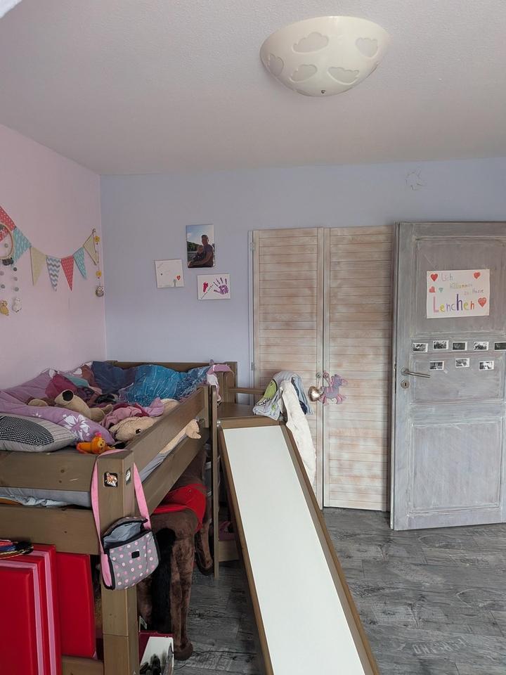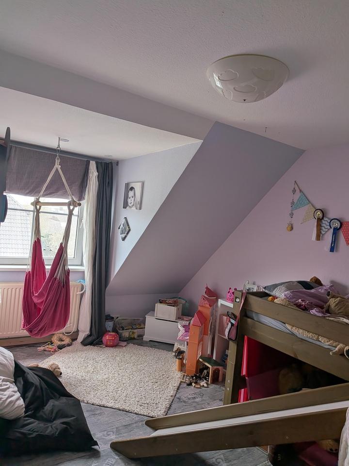 Der Dachboden wurde vollständig isoliert und zu einem charmanten Spielzimmer mit umfangreichen Lagermöglichkeiten ausgebaut. Eine praktische Raumspartreppe führt