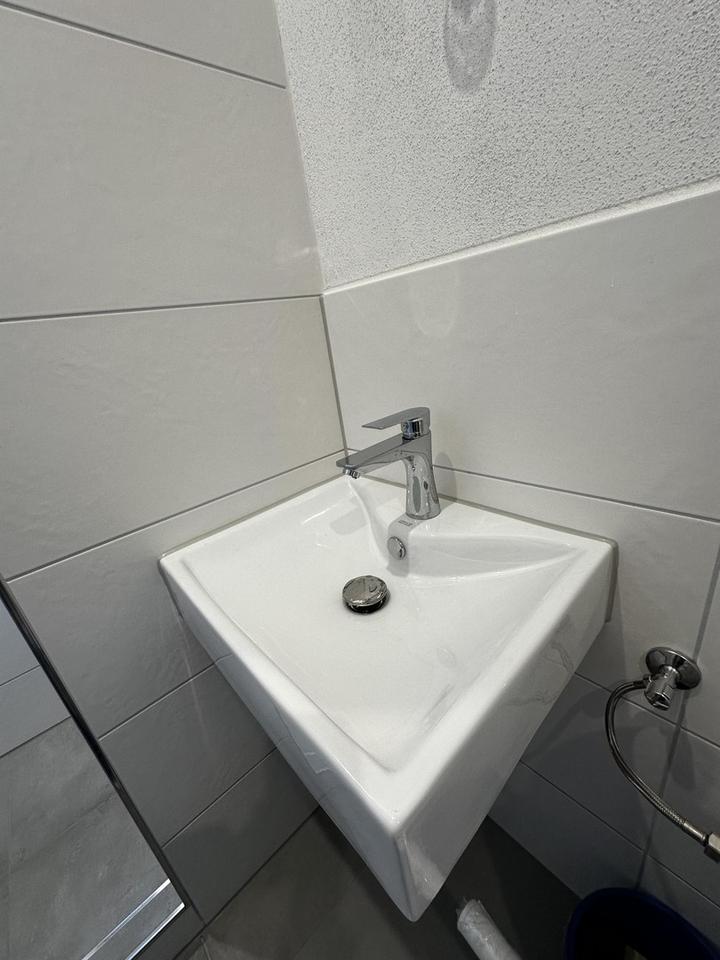 Das Badezimmer ist modern ausgestattet. Zur Wohnung gehört außerdem ein Kellerabteil, das zusätzlichen Stauraum bietet.