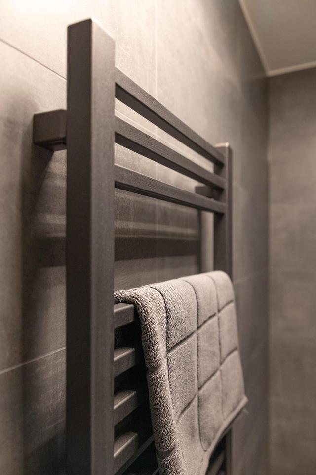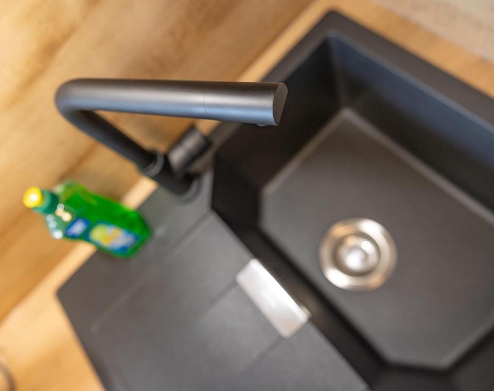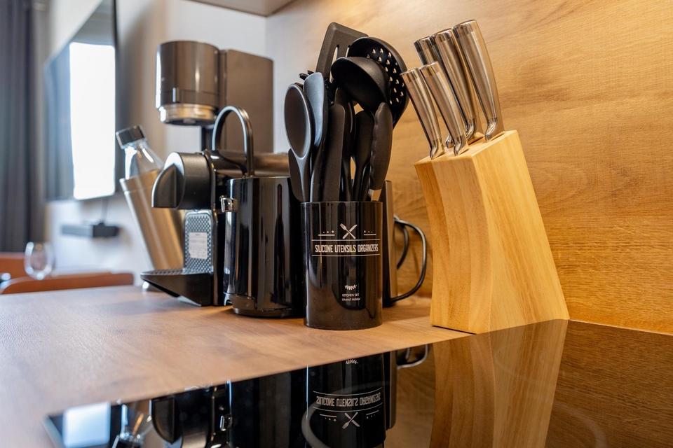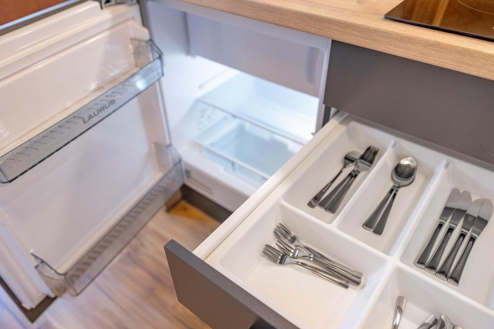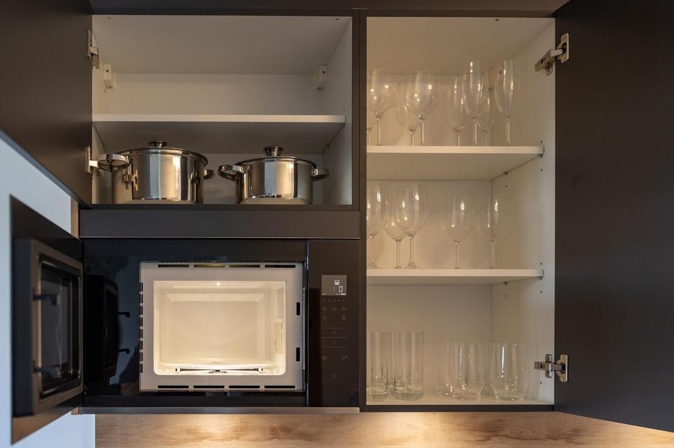 Die offene Einbauküche ist vollständig ausgestattet und verfügt über Kühlschrank mit Gefrierfach, Mikrowelle, Nespresso-Kaffeemaschine, Wasserkocher, Toaster sowie umfangreiches Küchenzubehör. Auch eine Waschmaschine ist bereits vorhanden.